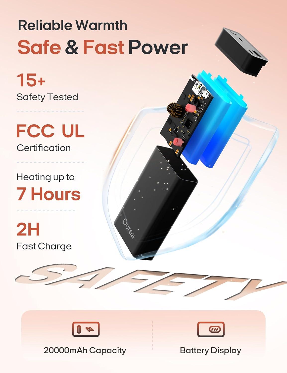 Long-Lasting Battery Life: Portable heated blanket enjoy up to 6 hours of warmth on a single charge, powered by a 20,000mAh fast-charging battery. Certified by FCC, GCC, and UL, the battery ensures safe and reliable performance. With 3 flexible power sources—cordless battery, car adapter, or outdoor power supply—this blanket keeps you warm wherever you go.