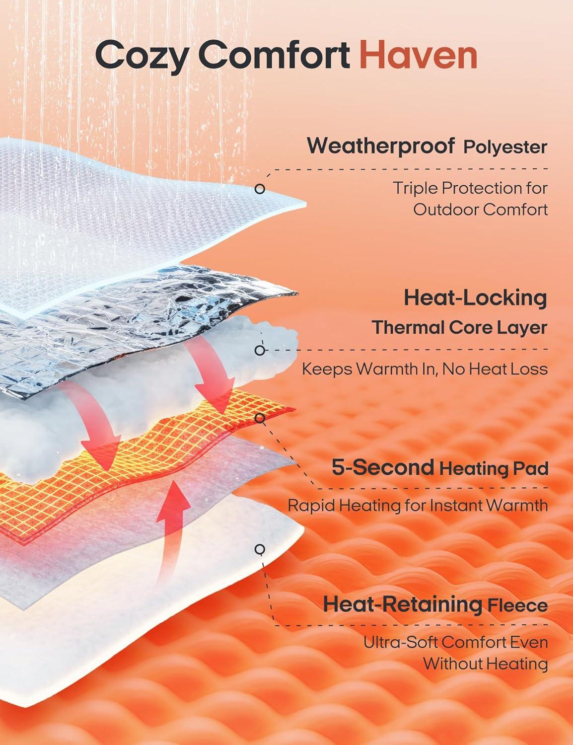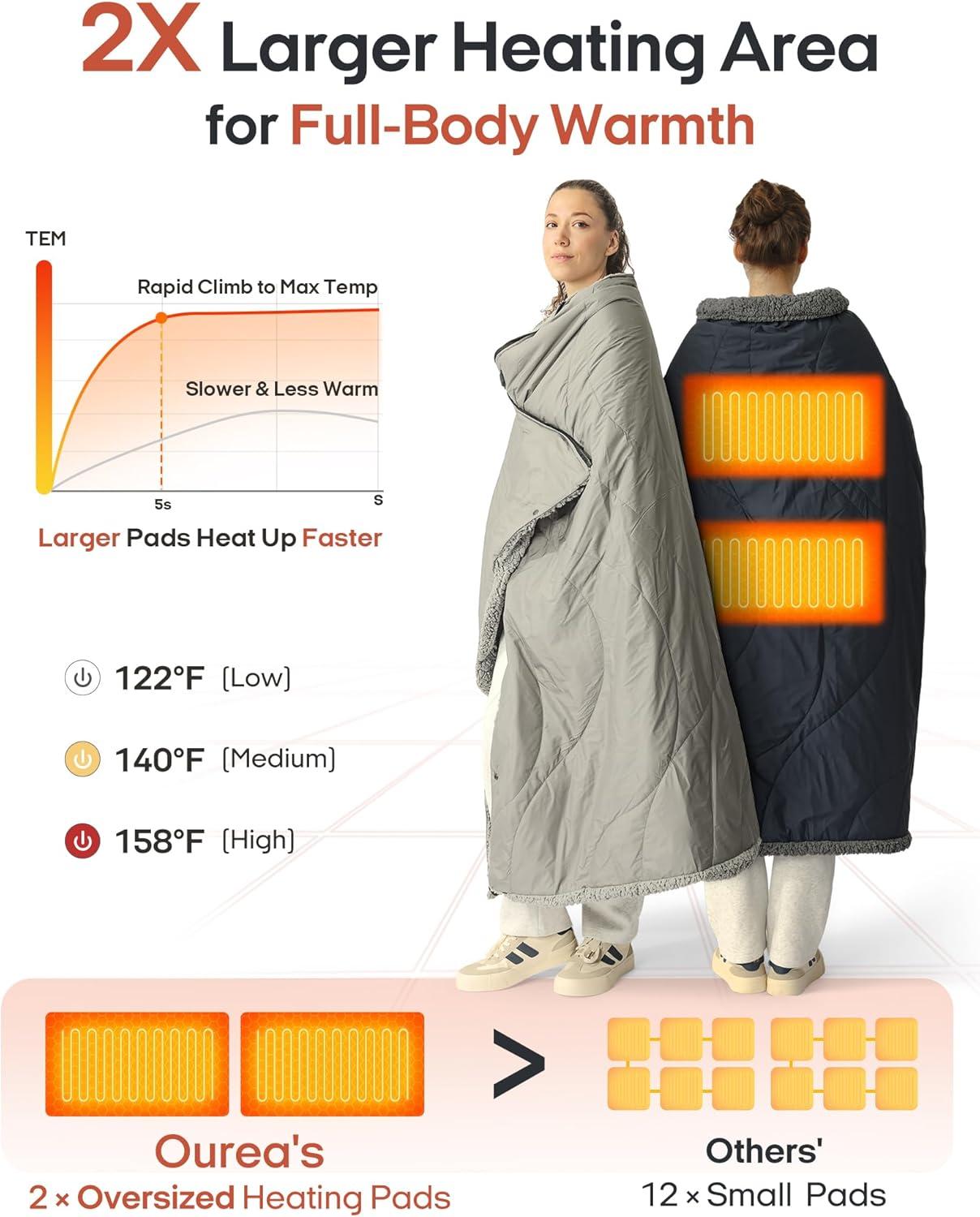 Fast & Efficient Heating with Ultimate Comfort: Ourea heating blanket adopts military-grade carbon fiber heating technology, which can quickly heat up in just 5 seconds. Choose from 3 heat levels (Low: 122°F, Medium: 140°F, High: 158°F). The interior features soft sherpa fleece,with feather silk filling, ensuring even heat distribution. Targeted heating zones for your back, waist, and hips provide long-lasting warmth and consistent comfort.