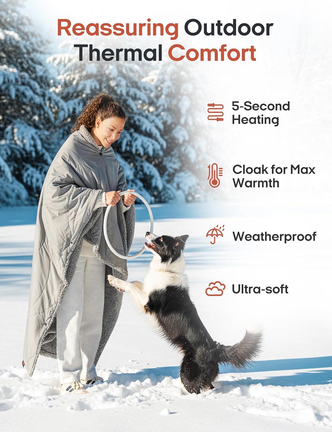Versatile & Hands-Free: Measuring 51×70 inches, this heated blanket is designed for comfort and flexibility. Use it indoors as a traditional heated throw for cozy relaxation, or wear it outdoors as a hands-free shawl. Snap buttons let you secure it as a cape for full mobility, while the compact foldable design makes it easy to carry anywhere.
