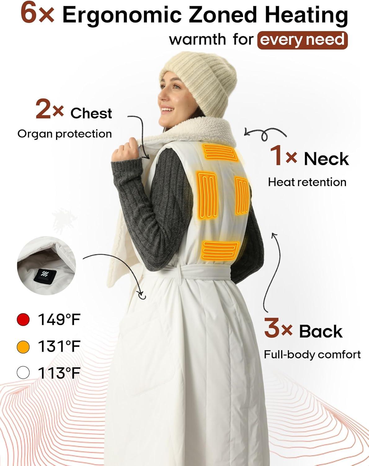 【Smart Temperature Control】— Features button-controlled 3-level heating (temperature range: 104°F–131°F–149°F). The heating blanket is equipped with 6 heating elements using carbon fiber heating technology, which work together to deliver warmth to the neck, hips, and back, improving blood circulation and keeping you comfortable even in extremely cold conditions.