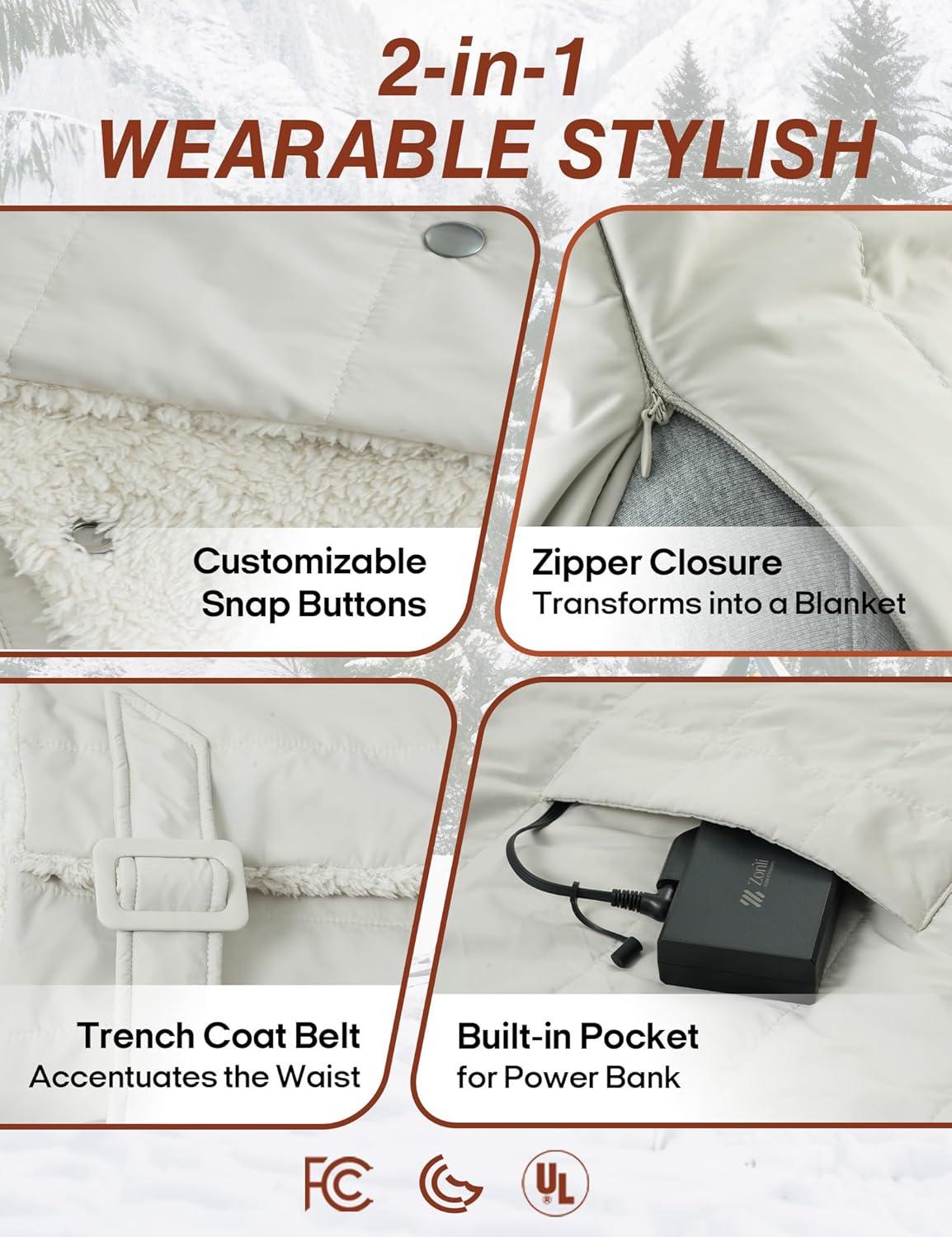 Zonli Heated Blanket Battery Operated for Outdoor Use - Fashionable, Cordless, Portable Electric Blanket with Rechargeable 10000mAh Battery - Wearable Heated Vest for Women,Black(Beige)