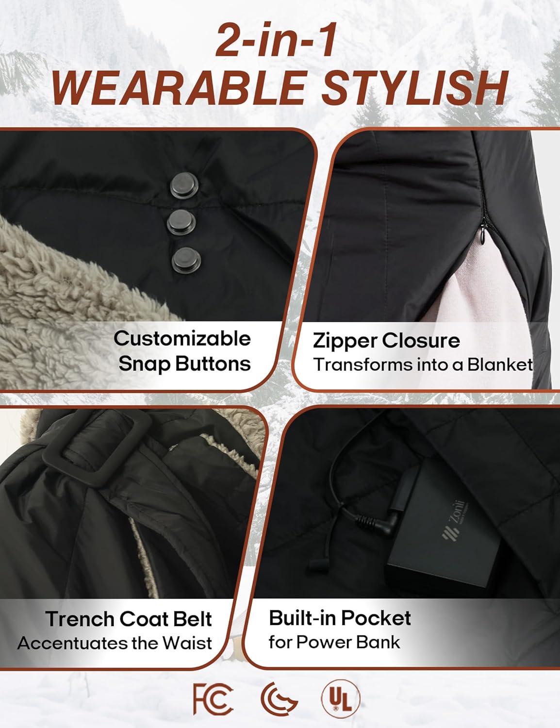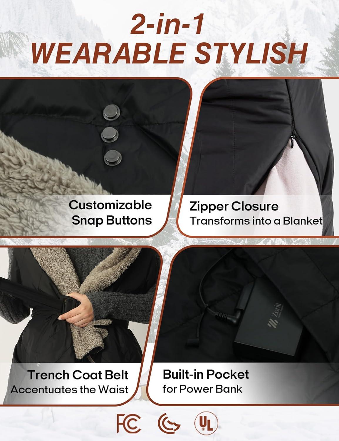 【Fashionable Wearable Design】: ZonLi upgraded portable heated blanket adopts an asymmetric and adjustable structure, allowing dual-purpose use. When in cold outdoor environments, it can be worn as a vest to provide continuous warmth. When indoors, its 53″ x 61″ size allows it to be used as a blanket to cover the body's core heating area, promoting blood circulation. You can enjoy warmth to your heart's content wherever you are.