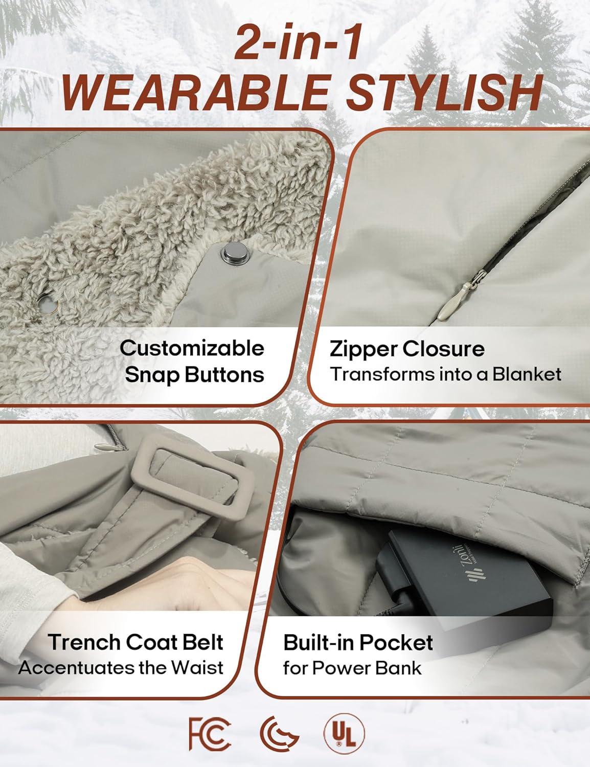 【Fashionable Wearable Design】: ZonLi upgraded portable heated blanket adopts an asymmetric and adjustable structure, allowing dual-purpose use. When in cold outdoor environments, it can be worn as a vest to provide continuous warmth. When indoors, its 53″ x 61″ size allows it to be used as a blanket to cover the body's core heating area, promoting blood circulation. You can enjoy warmth to your heart's content wherever you are.