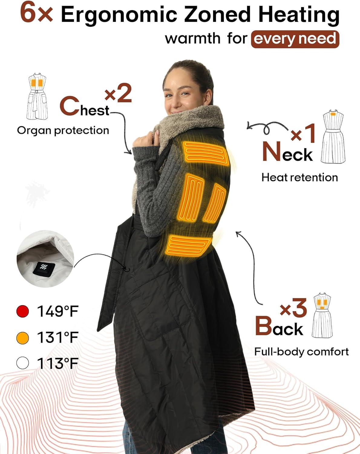 【Smart Temperature Control】— Features button-controlled 3-level heating (temperature range: 104°F–131°F–149°F). The heating blanket is equipped with 6 heating elements using carbon fiber heating technology, which work together to deliver warmth to the neck, hips, and back, improving blood circulation and keeping you comfortable even in extremely cold conditions.