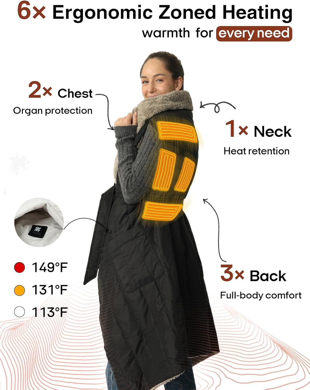【Smart Temperature Control】— Features button-controlled 3-level heating (temperature range: 104°F–131°F–149°F). The heating blanket is equipped with 6 heating elements using carbon fiber heating technology, which work together to deliver warmth to the neck, hips, and back, improving blood circulation and keeping you comfortable even in extremely cold conditions.
