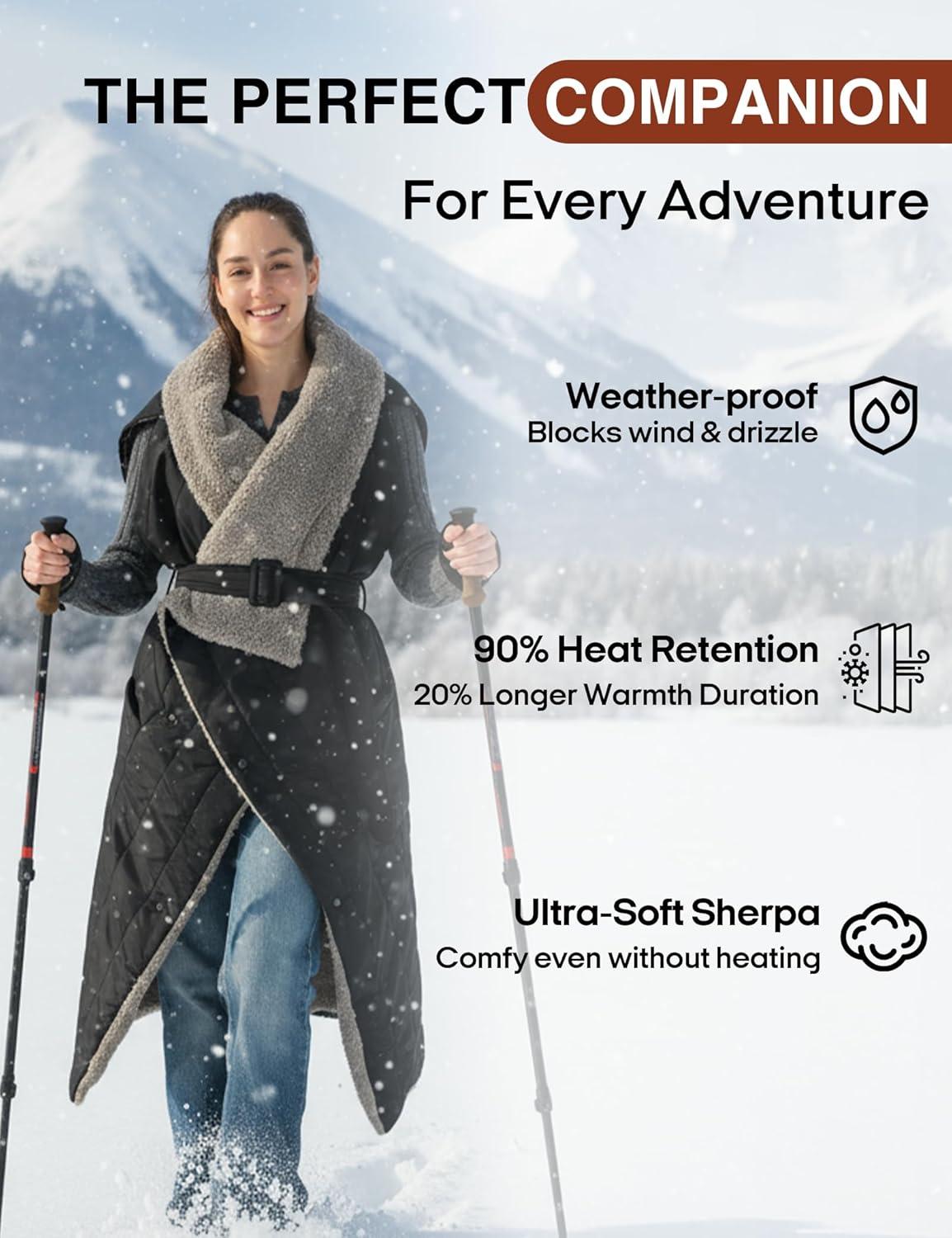 【Overheat Protection & Ideal Gift Choice】:To ensure safety, this rechargeable heated blanket is equipped with a 2-hour automatic shut-off function to prevent overheating. Whether you're camping, attending a sports event, hiking, or watching TV or working indoors, this portable heating blanket is the perfect choice. Adjustable sizes accommodate people of all body types, making it a thoughtful Christmas gift for your family. Can't wait to see their surprised expressions!