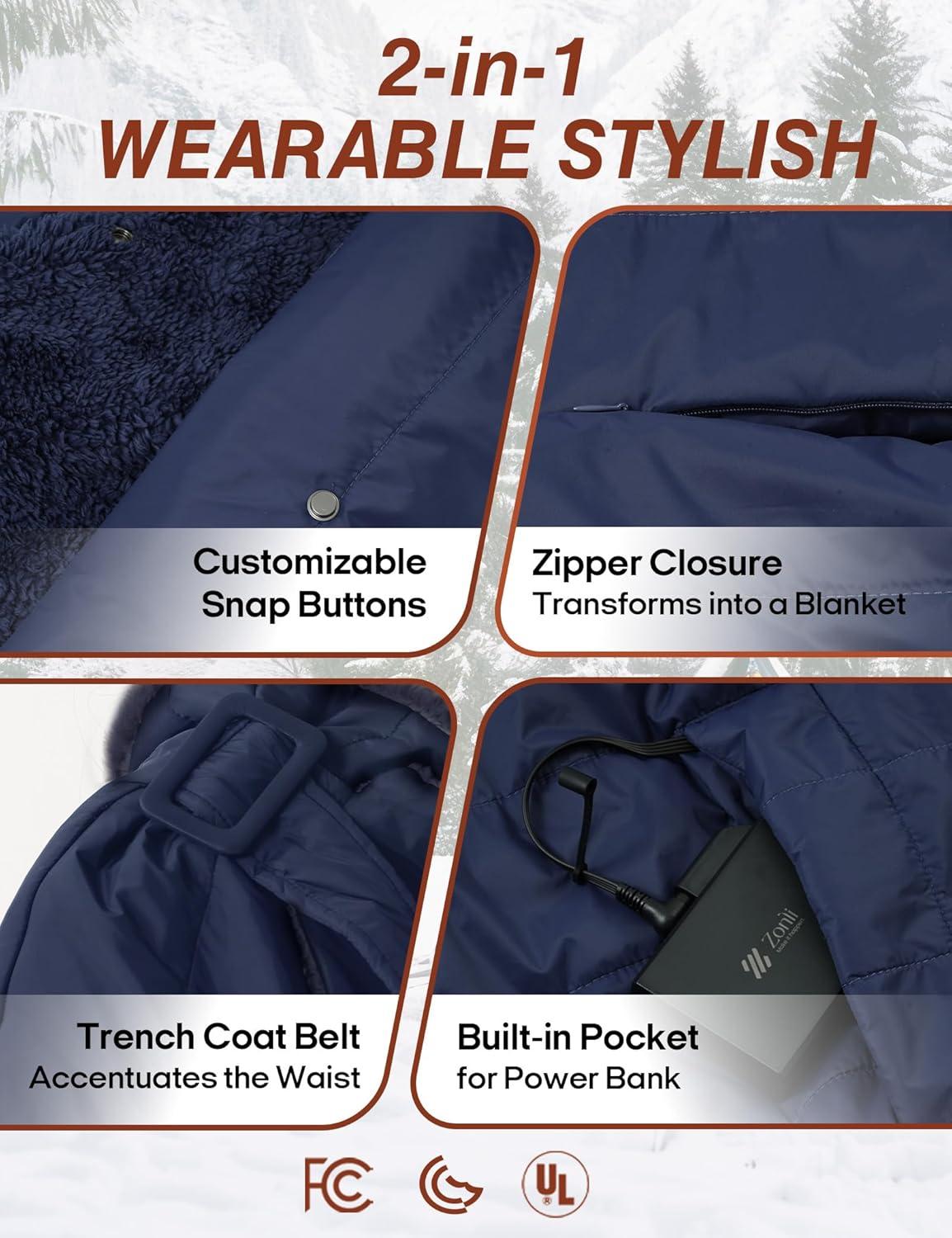 【Fashionable Wearable Design】: ZonLi upgraded portable heated blanket adopts an asymmetric and adjustable structure, allowing dual-purpose use. When in cold outdoor environments, it can be worn as a vest to provide continuous warmth. When indoors, its 53″ x 61″ size allows it to be used as a blanket to cover the body's core heating area, promoting blood circulation. You can enjoy warmth to your heart's content wherever you are.