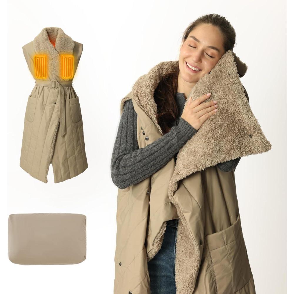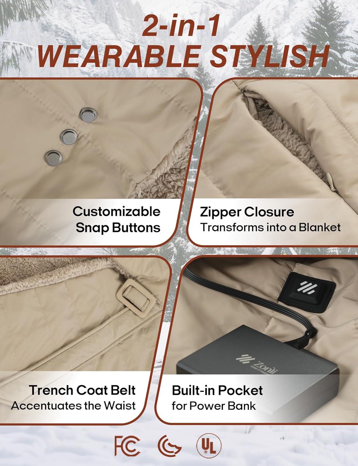 【Fashionable Wearable Design】: ZonLi upgraded portable heated blanket adopts an asymmetric and adjustable structure, allowing dual-purpose use. When in cold outdoor environments, it can be worn as a vest to provide continuous warmth. When indoors, its 53″ x 61″ size allows it to be used as a blanket to cover the body's core heating area, promoting blood circulation. You can enjoy warmth to your heart's content wherever you are.