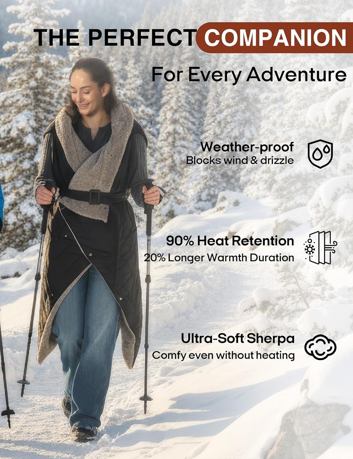 【Overheat Protection & Ideal Gift Choice】:To ensure safety, this rechargeable heated blanket is equipped with a 2-hour automatic shut-off function to prevent overheating. Whether you're camping, attending a sports event, hiking, or watching TV or working indoors, this portable heating blanket is the perfect choice. Adjustable sizes accommodate people of all body types, making it a thoughtful Christmas gift for your family. Can't wait to see their surprised expressions!