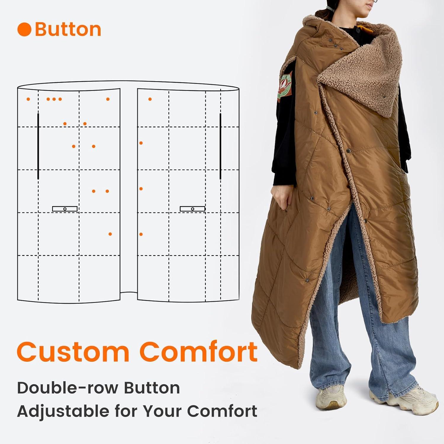Personalized Comfort Fit: Customize your warmth and comfort with our adjustable snap buttons. Whether you prefer a snug or loose fit, our blanket lets you stay warm your way without any compromises. Find your perfect fit for the ultimate coziness.